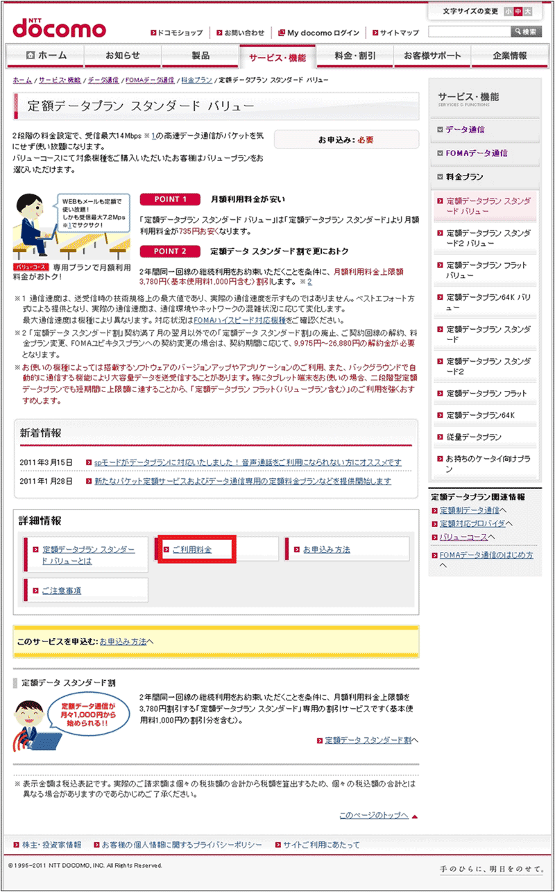さて、ここまでで見てこなかったのはデータ通信の料金だ。もう一度「料金・割引」(図18)に戻ってみよう。ページ中ほどにある「FOMAデータ通信」の「定額データプラン スタンダード バリュー」のリンクをクリックする。2段階の料金設定のプランだ。保険でしか使わない程度のため、こちらの定額のプランの内容を確認する。これが図23だ。