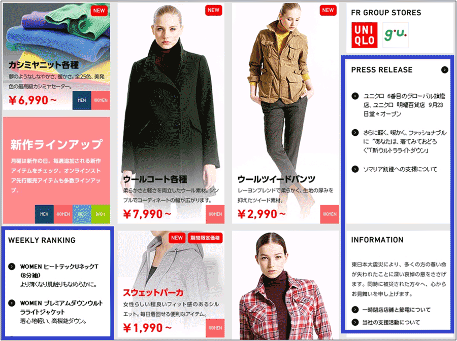 この部分は基本的に4段組みになっているが、「プレスリリース」「お知らせ」「ランキング」などは同じようなテキスト表現(図4の青枠で囲んだ部分)、それ以外は基本的には多くが商品カテゴリーへのリンクになっている。