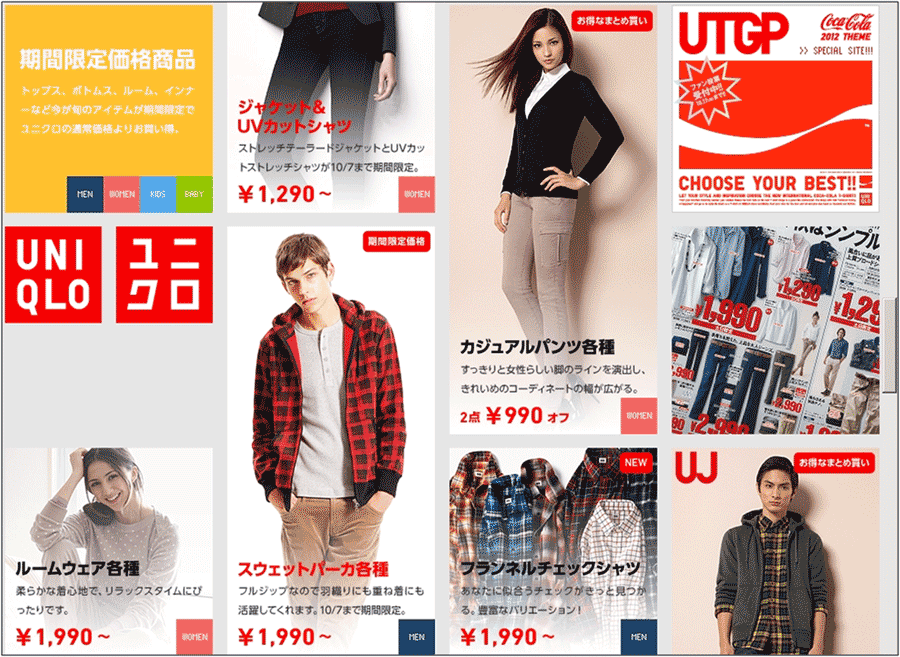 基本的に、メインビジュアル下のコンテンツは、この正方形と長方形の組み合わせで構成されている。「Facebookもチェック」というFacebookページへのリンクコンテンツもあるのだが、このサイズの長方形の1つに当てはめられている。