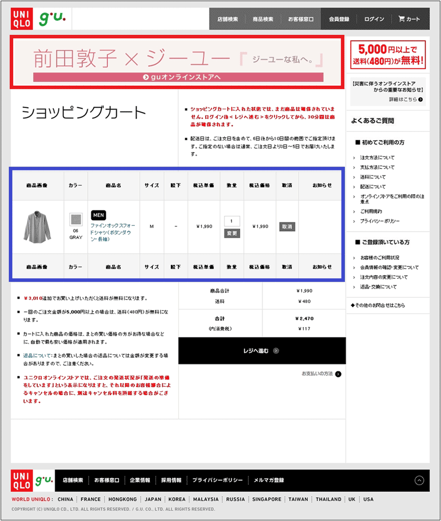 図12:ショッピングカートのいちばん上に「guオンラインストア」へのバナーがある(2011 年10月3日時点)