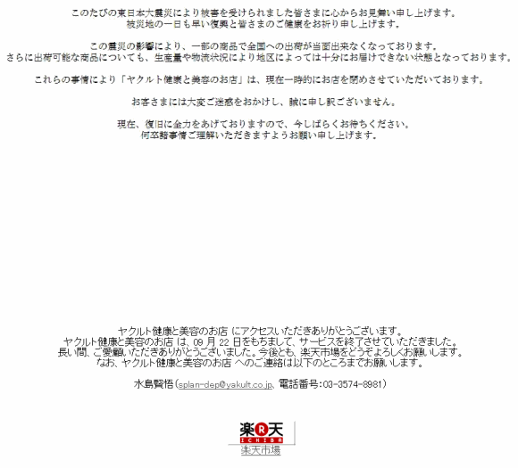 ヤクルト本社は9月16日、06年から楽天市場に出店していた「ヤクルト健康と美容のお店」を閉店した。東日本大震災で東北の生産工場が被災、商品供給が十分に対応できなかったことや、注文について販売会社との連携がうまく取れなかったこともあり閉店を決めた。決済方法が現金のみだったことも拡販につながらなかった理由に挙げている。