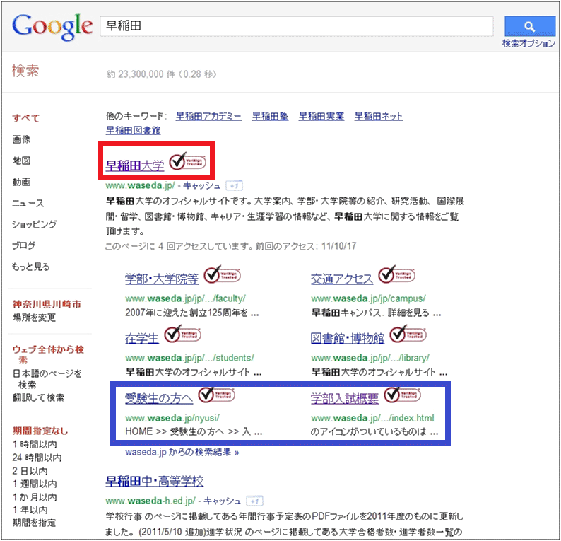 まずは検索エンジンで「早稲田」と検索してみる。「Yahoo! JAPAN」でも「Google」でも、「早稲田大学」が検索結果の第1位に表示される(図1と図2の赤枠で囲んだ部分)。