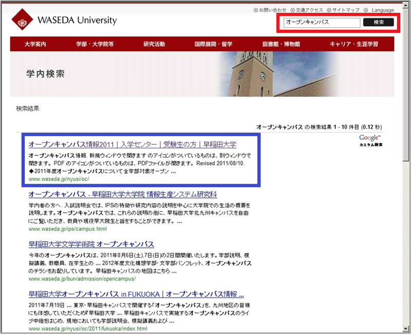 オープンキャンパスに参加したいので、最後はそのスケジュールを見てみることにする。「入試問題」のページなど階層の深いページに入ってしまうと、トップページにあったプルダウン形式で下階層のコンテンツに直接移動するようなことができないので、ここでは画面右上にあるサイト内検索の機能を使ってみよう(図14の赤枠で囲んだ部分)。「オープンキャンパス」と入力し、検索ボタンを押して表示されたページが図14だ。
