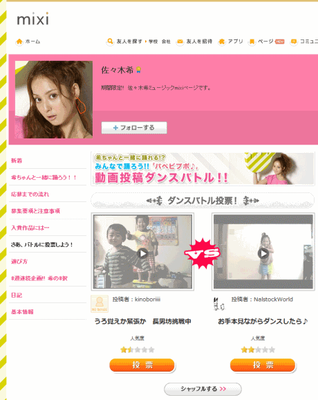 アプリの内容は公式mixiページ上で、ユーザーから投稿されたダンスの動画が一対一のバトル形式で次々と現れる仕組みを構築。それぞれの動画を見たユーザーによる投票で人気ランキングが決定する仕組みだ。動画と双方向のコミュニケーションを掛け合わせた。