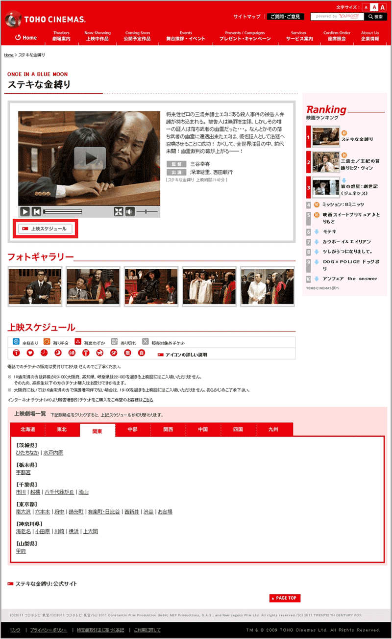 右側には、トップページにも表示されていた「映画ランキング」がある。メインの部分は、予告編の動画、「フォトギャラリー」「上映スケジュール」と内容はコンパクトだ。