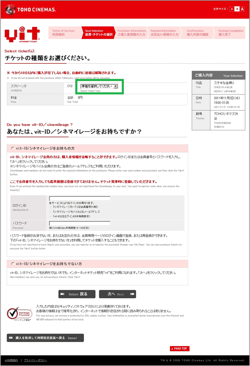 券種は「一般 1,800円」を選択し、「vit-ID/シネマイレージをお持ちでない方」のラジオボタンを選択して、[次へ]ボタンをクリックして先へ進む。