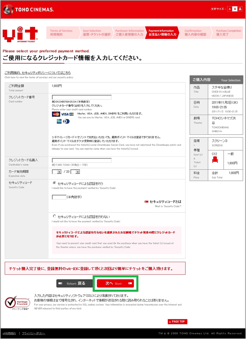 まずは姓名、電話、メールだけを入力すればよい。支払い方法で「クレジットカード決済」のところの[次へ]ボタン(図13緑枠で囲んだ部分)をクリックして、次へ進むと、クレジットカード情報の入力ページへ飛ぶ(図14)。