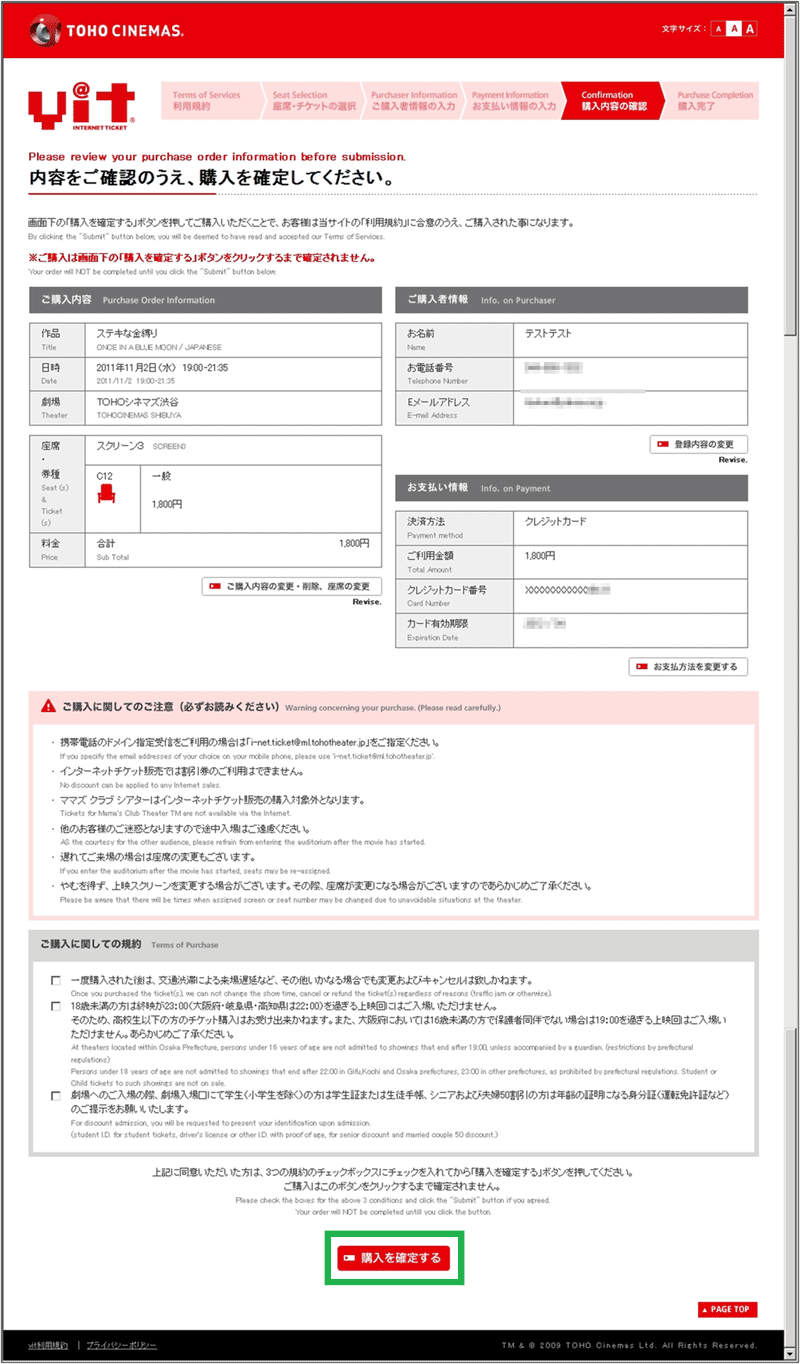 特に問題になることもなく、クレジットカード関連情報を入力して[次へ]ボタンをクリックすると、最終確認ページへ移動する(図15)。最終確認ページも特に問題の箇所はなかった。一番下のチェックボックスを入れて、[購入を確定する]ボタンをクリックして、チケット購入は終了だ。