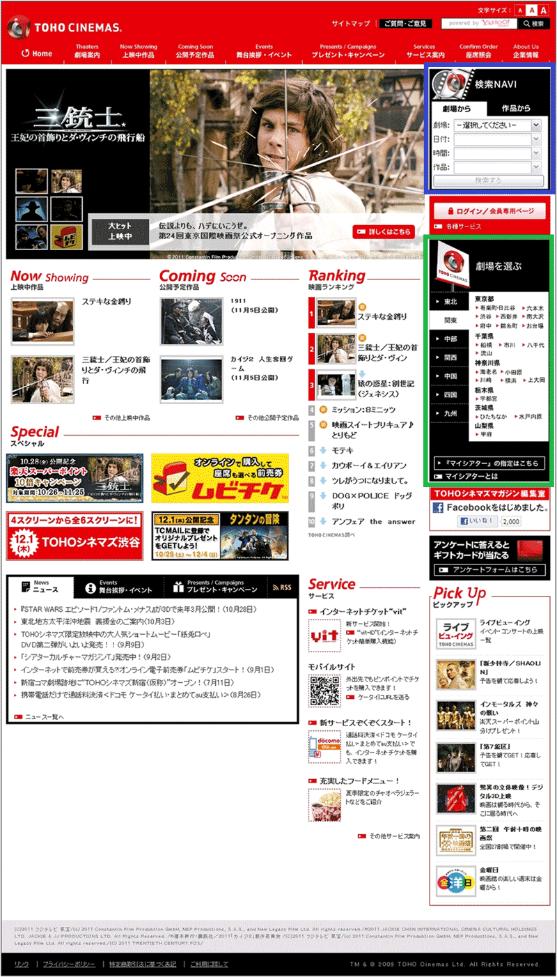 もうひとつ、トップページの右のナビゲーションの「劇場を選ぶ」から進んでみよう(図3の緑枠で囲んだ部分)。