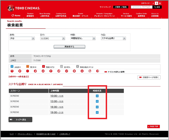 図18 が検索結果ページだ。「劇場」「日付」「時間」「作品」の各項目は、プルダウンで再検索も可能となっていて、使い勝手がよい。残席状況のところ(図18の赤枠で囲んだ部分)は、アイコンをクリックすると、直接購入ページに行くので、前出の図9青枠で囲んだ部分のように「購入」の文字も入っているのがよいだろう。