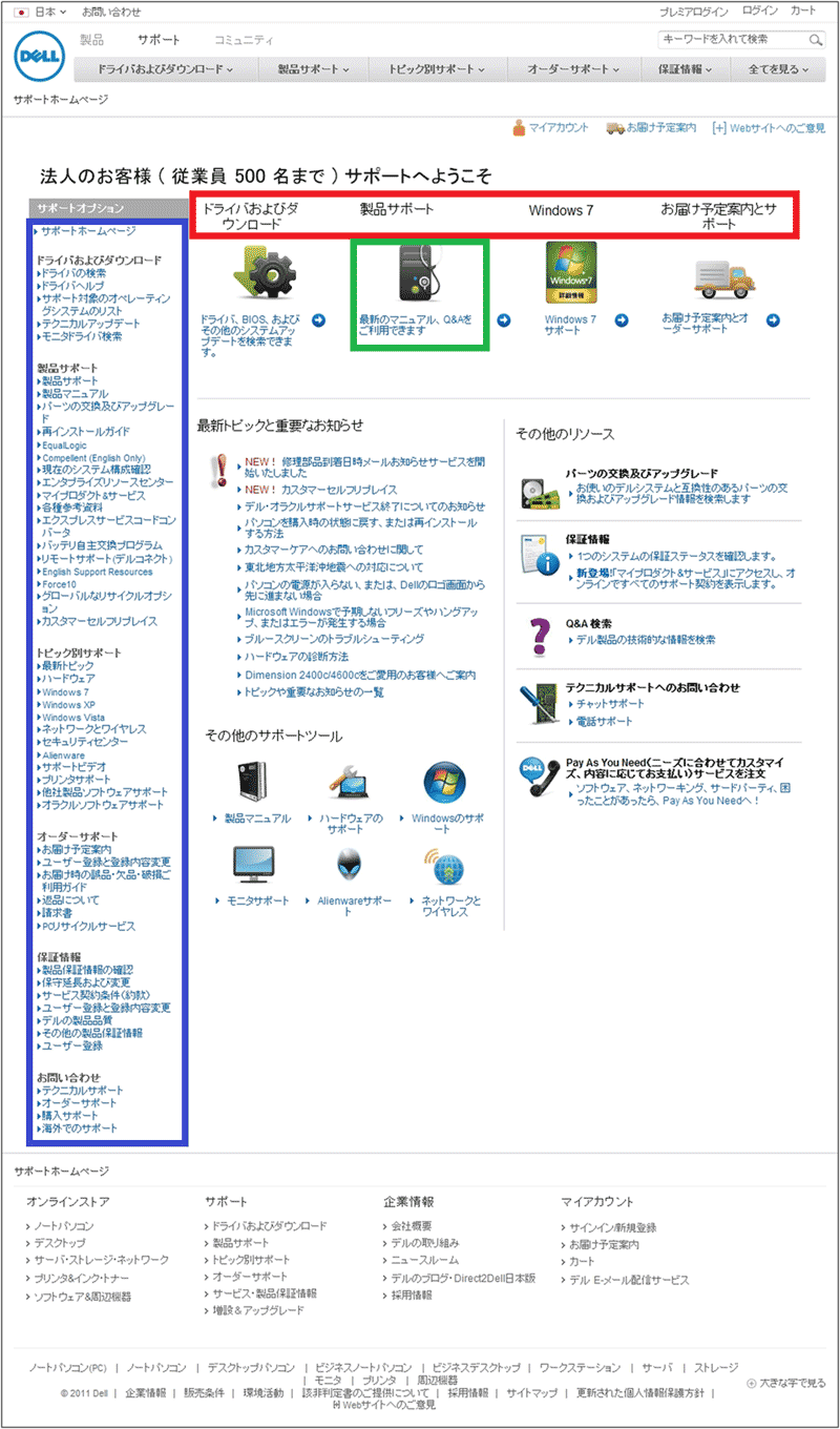 図8: 500名以下の法人を対象とした「デル」のサポートページ