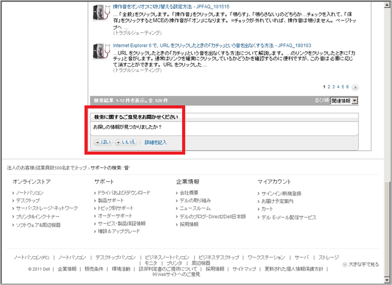 表示された情報が探している情報なのかどうかは、リンク先の問題解決ページを見てみないと判断できない。であるから、このページでは、情報が見つかったかどうかを尋ねるこのアンケートには、普通答えられない。そしてリンク先のページで情報が見つかって問題解決したら、わざわざこの検索結果のページには戻って来ないだろう。と考えるならば、情報発見と問題解決はセットにして、最後のページで聞くのがよいのではないだろうか。あるいは完全にサイトから去る時点で、情報発見と問題解決のそれぞれについて聞くのがよいと思う。