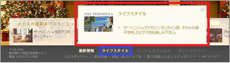 また下のフッターのナビゲーションは、「最新情報」以外、たとえば「ライフスタイル」(図3の青枠で囲んだ部分)をクリックすると、下からコンテンツへのリンクが含まれる長方形のエリア(図3の赤枠で囲んだ部分)がにゅるっと湧き出してくるような作りになっている。このクリックによるURLの変化はない。このエリアを消したいときには右上の[×]をいちいちクリックしなくてはならないのがわずらわしい。