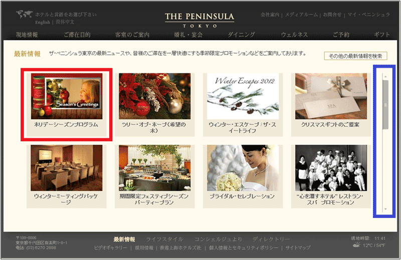 メインビジュアル部分に8つの画像があり、1つずつのコンテンツへのリンクになっている。訪問時は全体で18個の画像リンクがあり、縦スクロールのスクロールバーがあった(図5の青枠で囲んだ部分)のだが、薄くて分かりにくい。