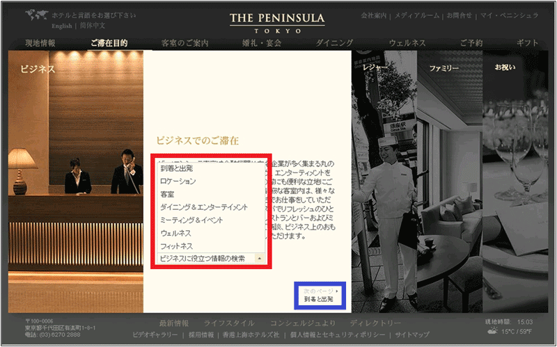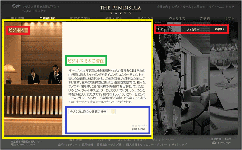 「ご滞在目的」のプルダウンメニューは4つある。この中から、たとえば「ビジネス」をクリックすると、まず4つのビジュアルが左右に4分の1ずつ均等に表示され、選択した「ビジネス」の部分の扉がスッと開くように、横幅が拡がり、最終的には図6の黄色枠で囲んだ部分のようになる。言葉だけで説明すると、いまいち動きのイメージが伝わりにくいと思う。上の「ビジネス」のリンクをクリックしていただくと、実際に動きを見ることができる。