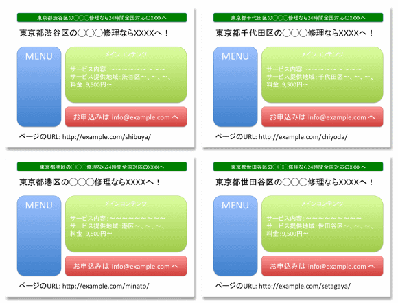 これは、さまざまな検索キーワードに対するランディングページを設けているサイトで、ロングテールSEOを狙っていると、うっかりとやってしまいかねないものだ。
