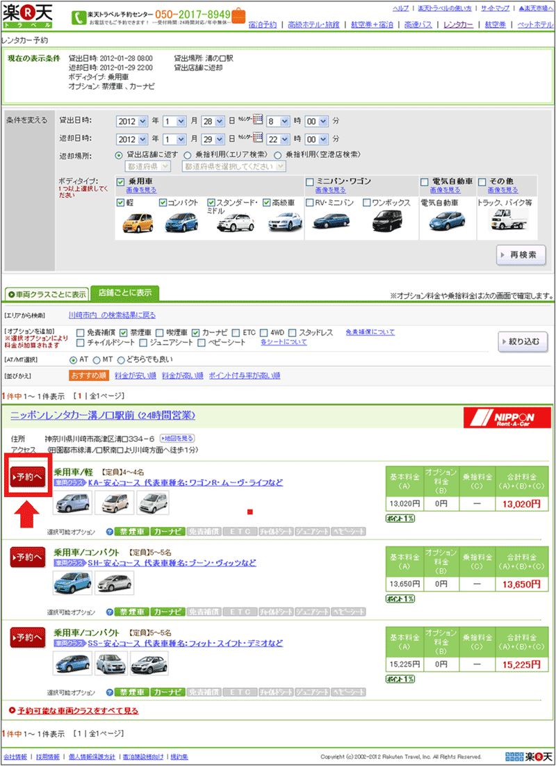 今回は近場を優先して、絞り込んだ後の「ニッポンレンタカー」の溝ノ口駅前店で表示された中で、一番上の車種の「予約へ」(図13の赤枠で囲んだ部分)を選択して進むことにする。