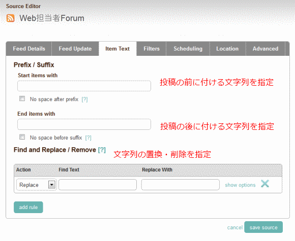 これまでも、ツイートするときに「サイト更新情報:」などの文字列を付けて流せるツールはありましたが、dlvr.itはそのあたり、かなり自由。配信内容の前後にメッセージを加えたりするだけでなく、内容の一部を自動的に削除したり置換したりということも可能です。