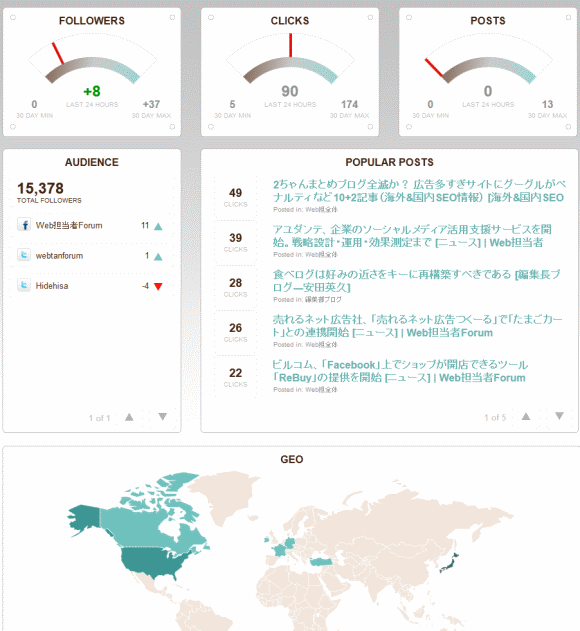 dlvr.itの短縮URLを使うことで、各コンテンツのクリック数もトラッキングできるようになっています。このあたり、本来ならば最終的なサイトのアクセス解析で行うのがいいと思うのですが、さらっと確認できるのはうれしいところ(各ソーシャルメディアアカウントのフォロワー数の増減なども併せて見せてくれるのは良いですね)。