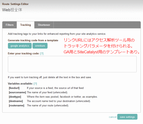 もっとちゃんと解析したい場合は、自分が使っている解析ツール用のトラッキングパラメータをURLに自動的に付けるようにも設定できます。