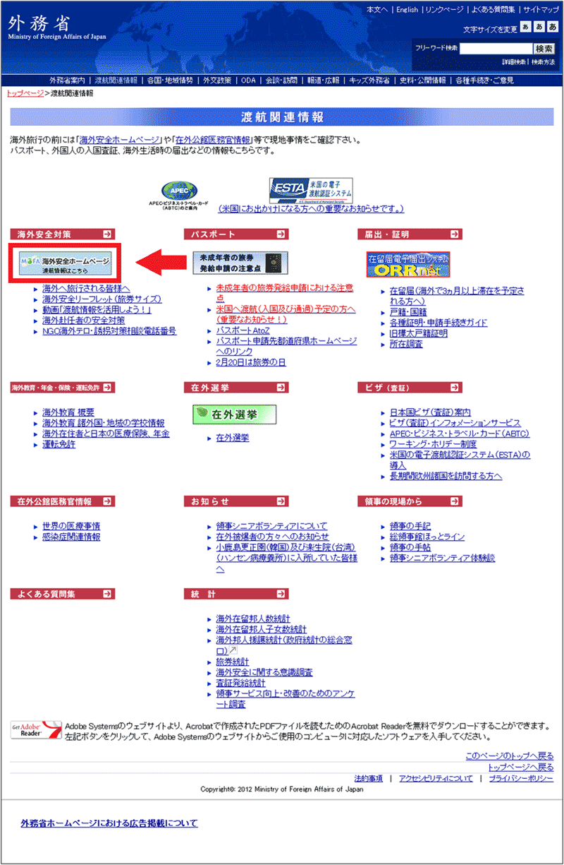 トップページのグローバルナビゲーションを見ると、左から2番目に「渡航関連情報」というのがあるので、まずこれをクリックしてみる。すると現れるのが図4の「渡航関連情報」のページだ。
