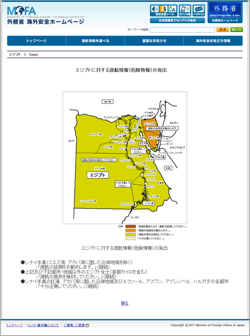 図7の青枠で囲んだ部分に「地図1」というリンクをクリックしてみると、「エジプトに対する渡航情報(危険情報)の発出」というページが表示された(図8)。