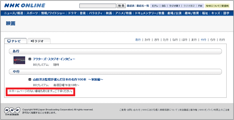 だとすると、先ほどの図9での2件しかない番組表示はなんだったのだろうか。改めて図9のページを確認すると、「※ホームページのない番組もあります。ご了承ください」と書いてある(図9の赤枠で囲んだ部分)。特に映画のように1つずつが個別のコンテンツの扱いになるのか、一連のシリーズものを1つの「番組」としてカウントするのか、それによって検索結果の表示は異なる。こういう検索結果で、番組のコンテンツをどう見せるのかは、案外難しいのかもしれない。