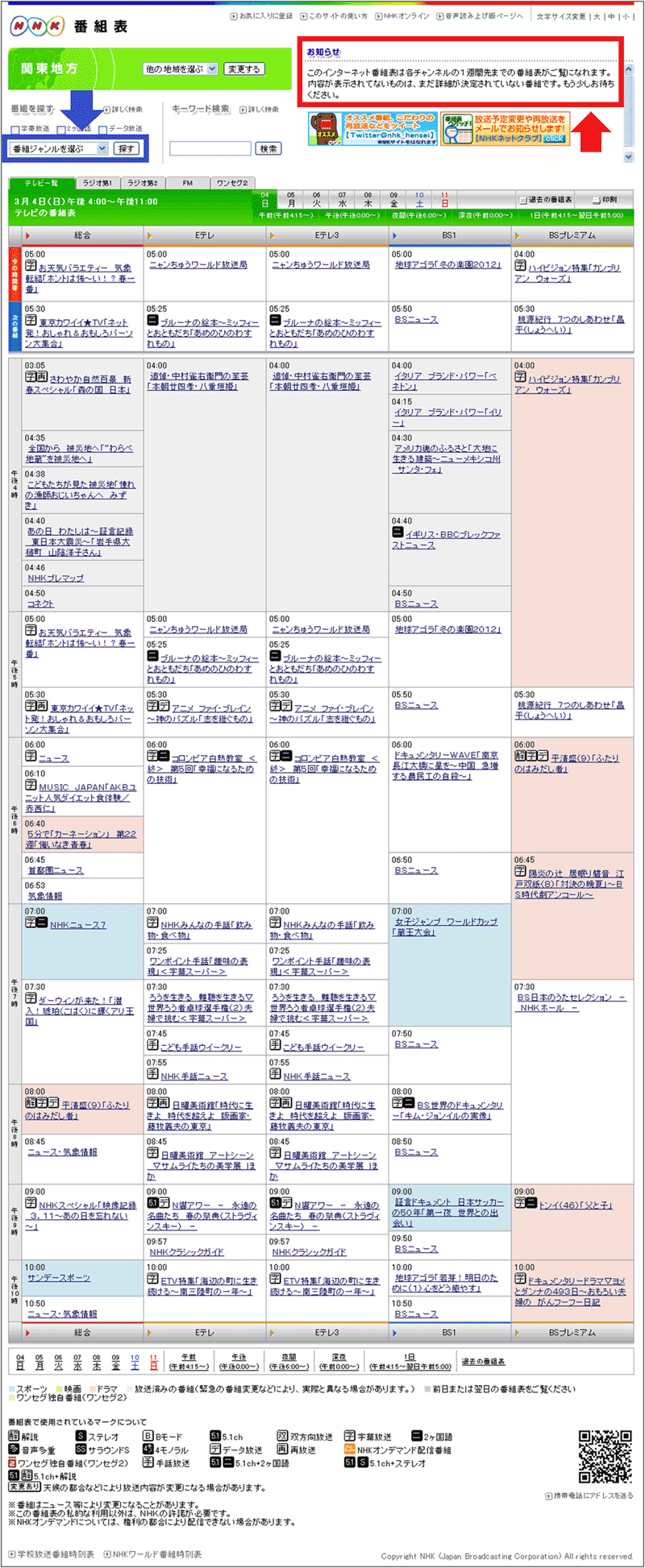 右上の「お知らせ」を見ると(図10の赤枠で囲んだ部分)、このページでは1週間先までの番組表を見ることができるようだ。左上には番組ジャンルを選ぶ機能があるので(図10の青枠で囲んだ部分)、クリックしてプルダウンメニューを表示させてみた(図11)。