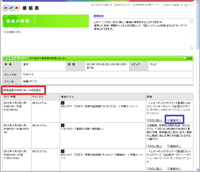 さて、番組検索結果画面に話を戻そう。各映画の詳細解説のところには「番組HPへ」というリンク(図12の青枠で囲んだ部分)があったので、それをクリックすると、移動した先は「NHK BSオンライン」の「映画」というページだ(図13)。