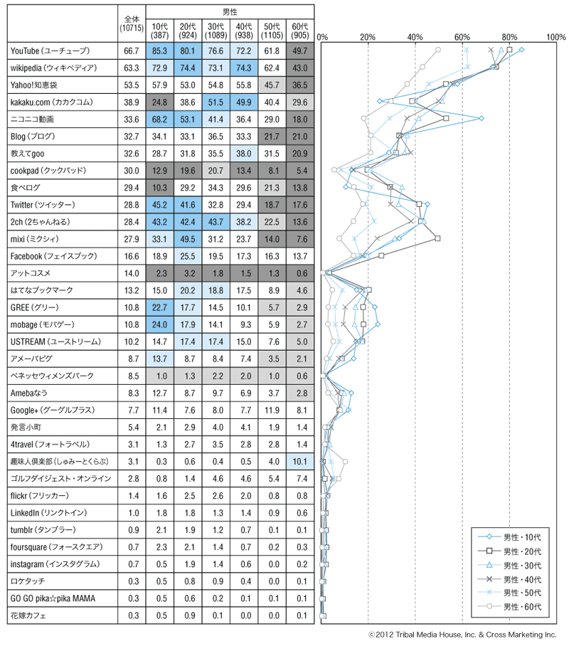 また、どの世代においてもコミュニケーション系のサービスは上位にランクインしていますが、年代によって利用されている主要サービスが変化しているという発見がありました。プラットフォーム別の利用率上位を見ると、10代はTwitterが、20代男女と30代女性はmixiが、30代~50代男性は2ちゃんねるが、50代男女と60代男女はBlogという結果になっています。