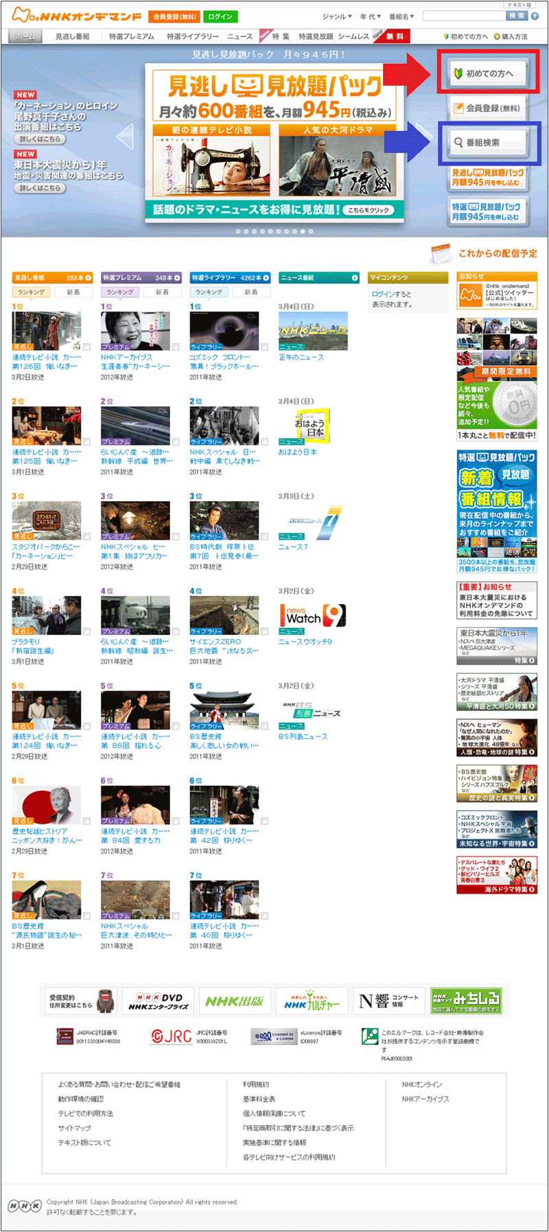 まず「初めての方へ」(図16の赤枠で囲んだ部分)をクリックすると、「NHKオンデマンドとは」のページ(図17)に行く。