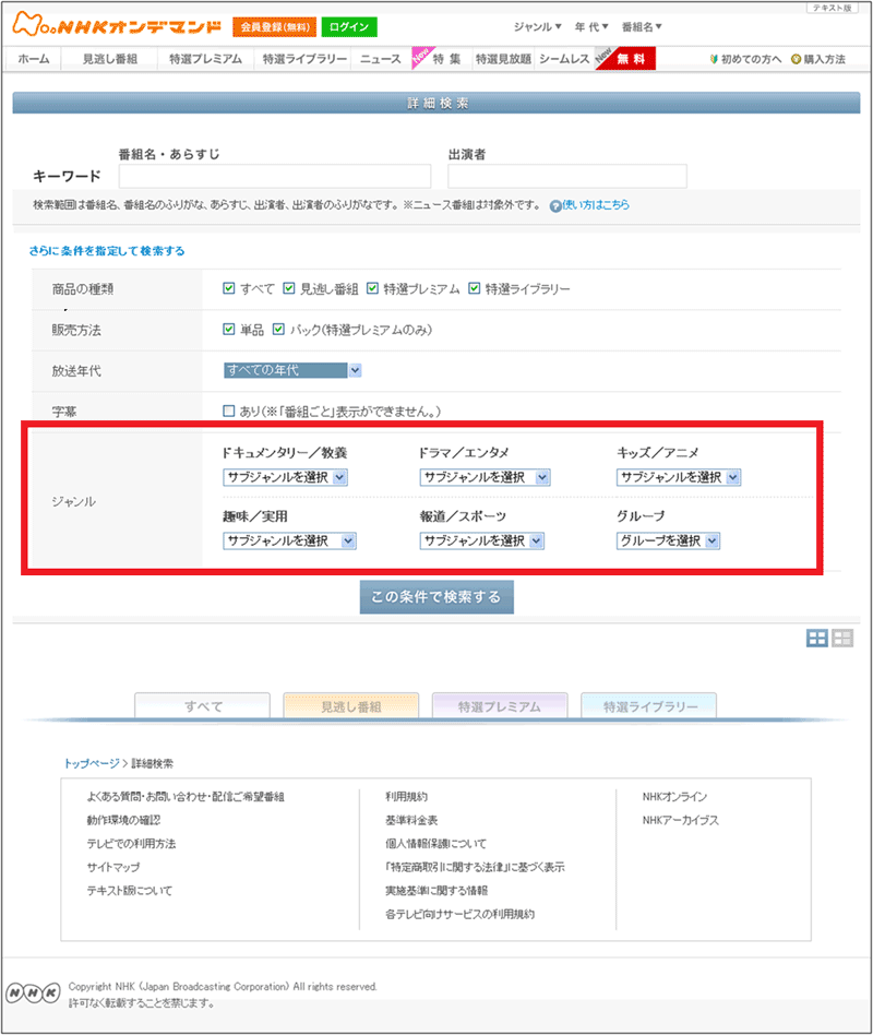 そこで、図16のNHKオンデマンドのページで「番組検索」(図16の青枠で囲んだ部分)をクリックする。そうすると「番組検索」のページに飛ぶ(図18)。