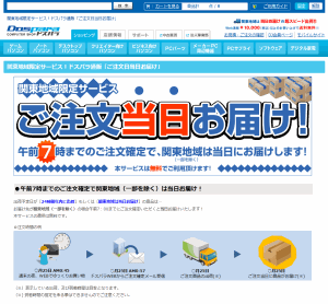当日配送を行うサイトはパソコンや周辺機器を販売する「ドスパラ」。朝7時までに注文が完了した商品を無料で当日中に配送する。対象地域は東京、神奈川、千葉、埼玉、茨城、栃木、群馬、山梨の1都7県。離島など一部地域は除く。対象商品はオリジナル商品など在庫のある商品に限定する。