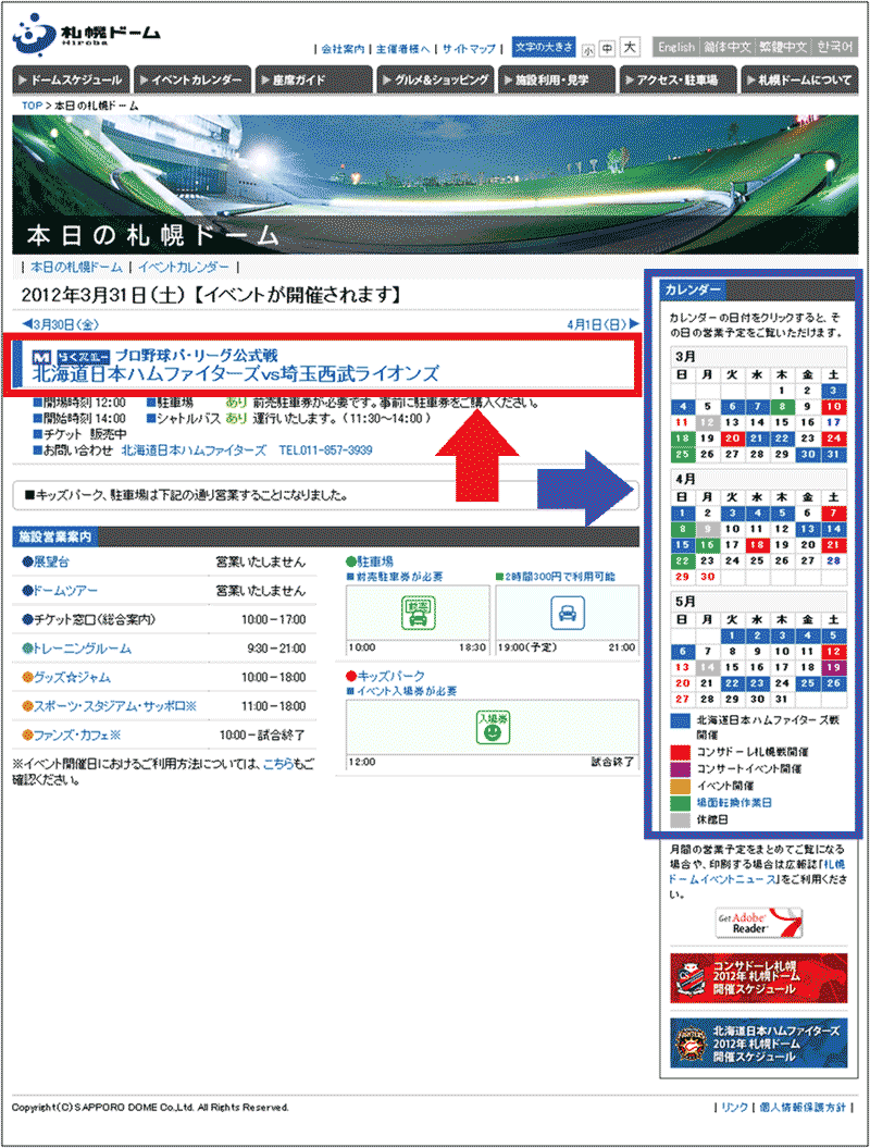 これは他のページにも共通することだが、HTML上のタイトルタグが全ページで「札幌ドーム」のままのようだ。これは各ページで独自の内容に変えるほうがいい。たとえば、このページならば「イベントカレンダー | 札幌ドーム」などにがいいだろう。