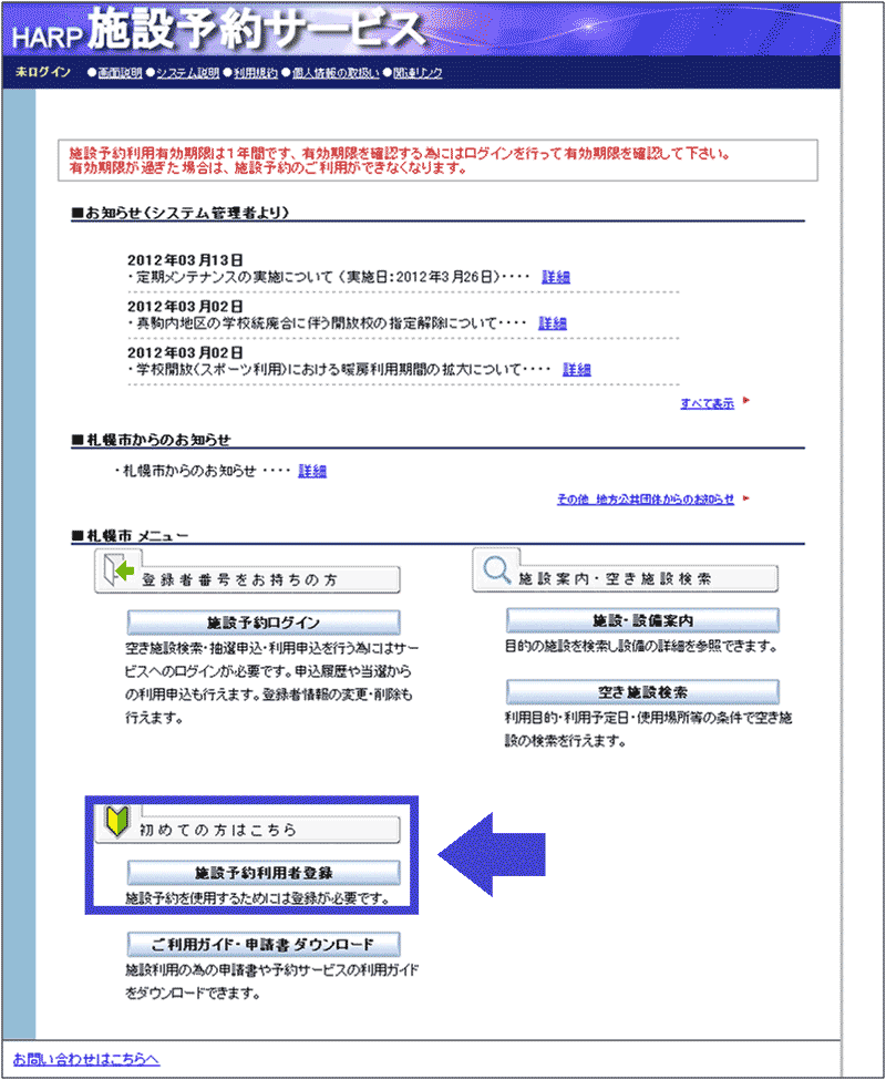 初めて予約をする人は、まず登録が必要となる(図15の青枠で囲んだ部分)。この予約システムは、「札幌ドーム」とは別のWebサイトになるので、今回はこれより先に進むのはやめておくが、行政の施設共有で各施設の予約機能やスケジュール管理が集約されているのは結構よいかもしれない。