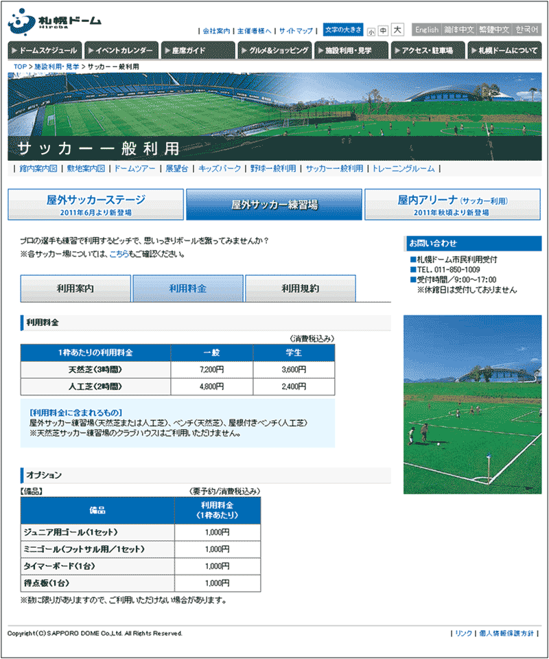 「屋外サッカーステージ」は平日10万円、1枠は3時間ということなので、やはり練習場とは格段に値段が違う。「屋内アリーナ」も平日1枠3時間で、6万円から9万円と利用人数に応じて幅がある。やはりそれなりの料金だ。「屋外サッカーステージ」と「屋内アリーナ」の2つは、「札幌ドーム市民利用受付」電話で申し込みをして、申し込み多数だと、利用前々月10日に抽選で決定するという仕組みだった。