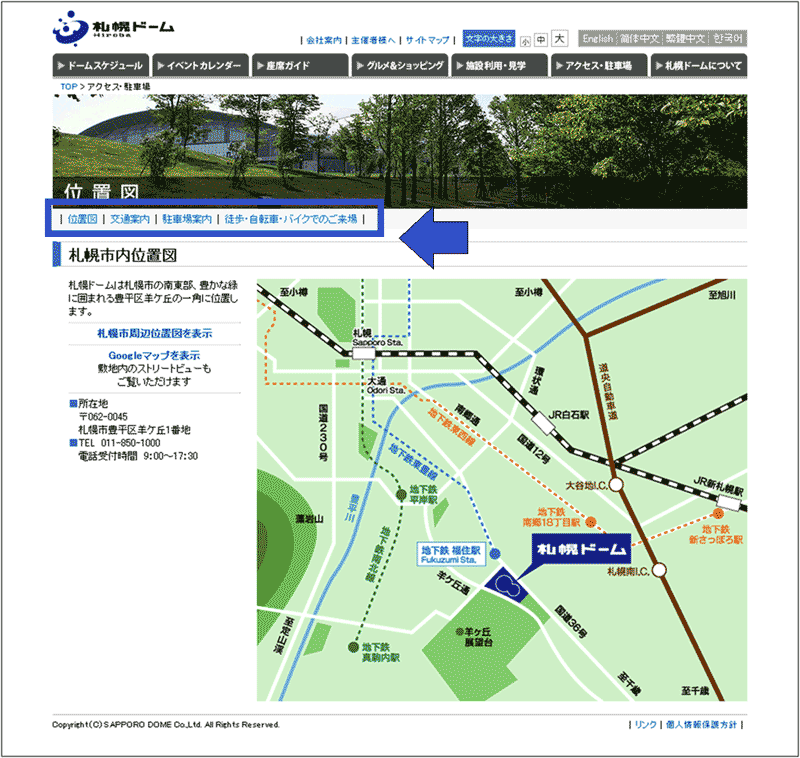 こうしてくまなくこのWebサイトを見てくると、このサイト全体のページの作り方が、だんだん見えてくる。グローバルナビゲーションのメニュー(たとえば「アクセス・駐車場」)をクリックすると、第2階層のサブメニュー(位置図、交通案内、駐車場案内、徒歩・自転車・バイクでのご来場)の一番左にあるページ(位置図)が表示される。第2階層のコンテンツはここから選択するというのが基本的な構造になっているようだ。現在いるページの所在もわかりにくいので、この構造であれば、サブメニューをタブのように見せて、現在地を明確にした方が親切だろう。