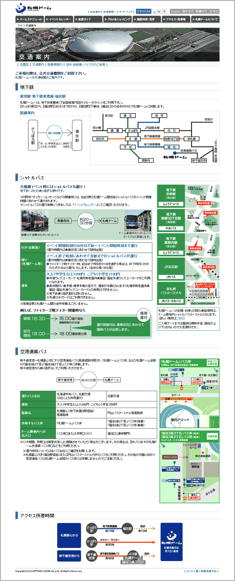 次は、札幌ドームの施設の場所を確認しておこう。グローバルナビゲーションの「アクセス・駐車場」を選択する。「札幌市内位置図」のページ(図17)に来るが、それぞれ最寄りの駅などからの所要時間の記載はない。