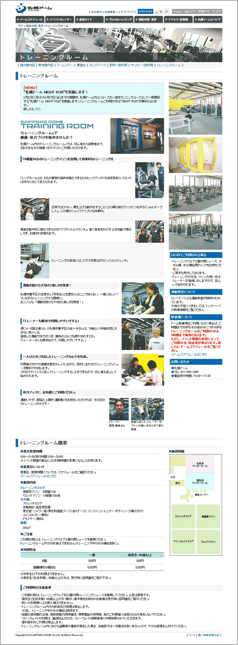 将来トレーニングルームなども利用してみたいと思っていたので、グローバルナビゲーションの「施設利用・見学」カテゴリーにある「トレーニングルーム」のページも覗いてみよう(図20)。1回500円で利用できるようなので、近場に住んでいる人には重宝するかもしれない。