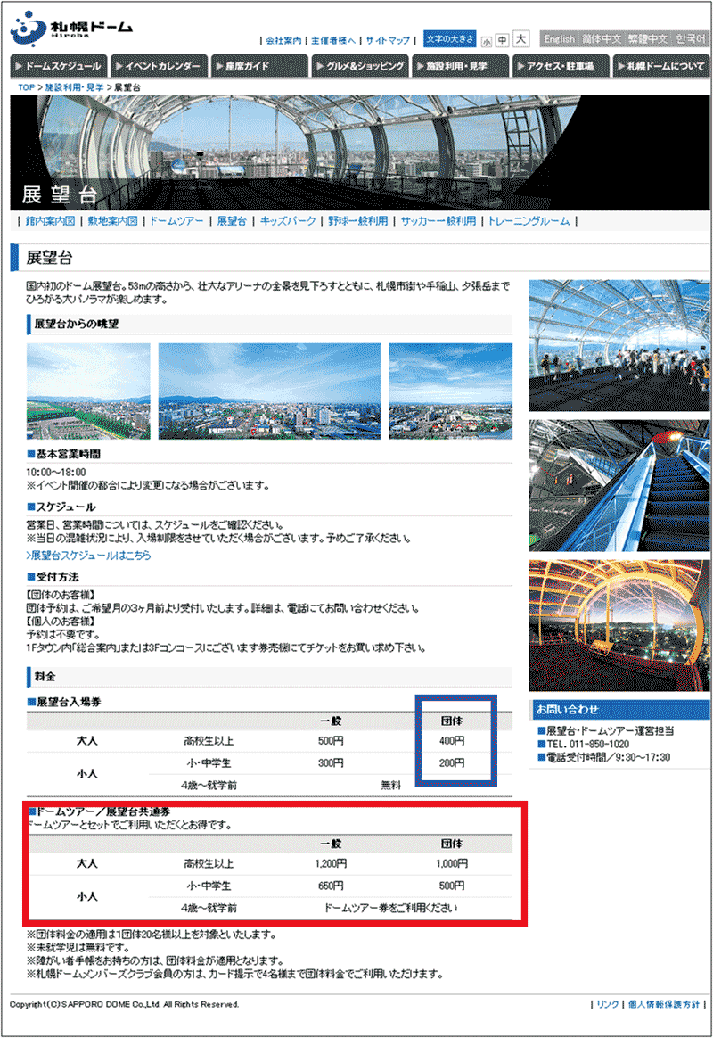 札幌ドームには展望台などもあり、団体料金も設定されている(図21の青枠で囲んだ部分)。団体料金はもっと大胆に下げてもよいような気がするが、単に観光施設としても楽しめるだろう。実際ドームツアーと共通券というのもある(図21の赤枠で囲んだ部分)。