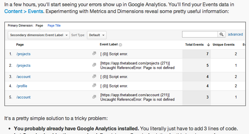 そこでGoogleアナリティクスを利用したエラー計測方法をこちらの記事で紹介している。以下のコードをデフォルトのトラッキングコードのあとに追加するだけだ。