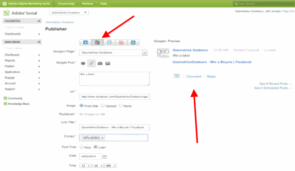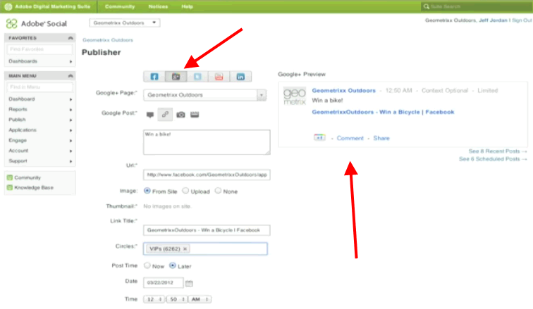 さらにキャンペーンの告知用にFacebookやTwitter、Google+向けの投稿文を、続けてAdobe Socialで作成する。スケジュール配信にも対応しているので、複数のソーシャルメディアに一斉投稿も可能となっている。