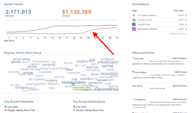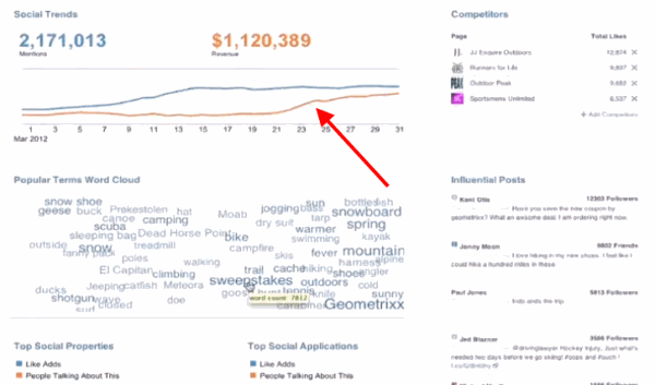 まずは現状を把握するにあたり、Social Overviewレポートを開く。画面下のSocial Trendsをみると、ソーシャルメディア上でのメンション(青の線グラフ)はキャンペーンとともに増加傾向にあるものの、収益(オレンジの線グラフ)は横ばいとなっているため、何らかの対応策を取る必要があることがわかる。