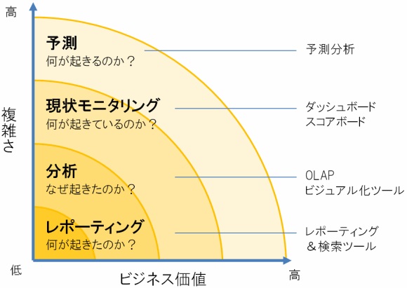 下図は、レポーティング→分析→現状モニタリング→予測分析というように、対象データの時間という概念を踏まえた4種類の取り扱い方を図示したものになるが、測定データの増加やクエリー条件の多様化により大きく前進してきているとはいえ、現状はまだまだ下図でいうところのレポーティングの段階にあるのが大半だと思われる。