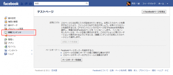 「掲載コンテンツ」では、Facebookページの左下に表示される「お気に入り」「ページオーナー」を登録できます。