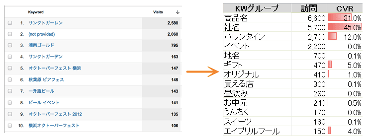 こうして得られたカテゴリ別の検索キーワードレポートを見ると、上位の一部だけでなく、全体を見渡すことができるようになる。