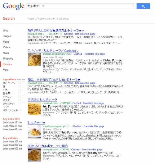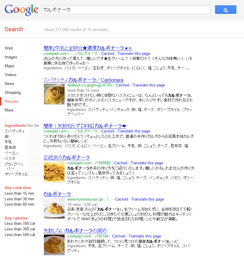 僕らが書き込むマークアップの中に含まれるデータからどんなものが生まれ出ようとしているのか、その例としてはグーグルのレシピ検索を見れば十分だろう。