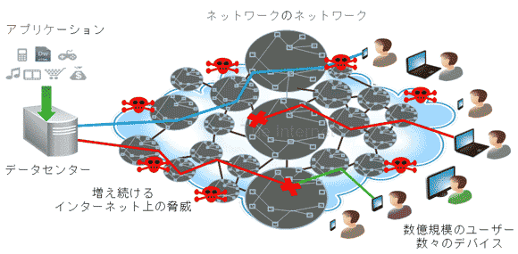 Webサイトが格納されたデータセンター(Webサーバ)とWebを閲覧するエンドユーザーを結ぶインターネットは、利用する側からするとシンプルに見えるものだ。しかし、実際には数億規模のユーザーがスマートフォン、タブレットなど多様なデバイスでインターネットに接続しており、複雑かつ様々な脅威にさらされている。Webサイトのグローバル化にともない、世界中からアクセスが集まるようにもなっている。