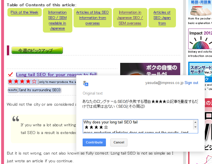 ただ、自動翻訳は便利だが、必ずしも正確に訳してくれるとは限らない。今回新しく追加された機能を使うと、自分で修正した翻訳をユーザーに提供できる。ユーザーがChromeやグーグルツールバーを使っていたとしても適用される。