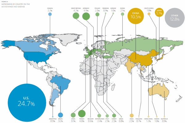 Googleが発表したディスプレイ広告のトレンドレポート“Display Business Trends: Publisher Edition”によると、2011年にダブルクリックとGoogleアドセンスにより露出された広告のインプレッション消費全体において、日本での消費が占める割合は約6%となっている。これは、アメリカ、中国に次ぐ3位に位置する。上位25カ国の中でも特に中国と日本のシェアは著しく伸張していると報告されており、企業のマーケティングにおいてディスプレイ広告の重要性は増してきていることがわかる。